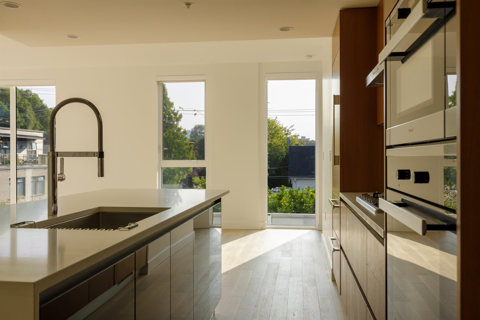 The home features a high-end Italian Scavolini kitchen with integrated Miele appliances, quartz countertops, under-cabinet LED lighting, and a large island ideal for cooking and entertaining. The open-concept living and dining area is complemented by 9-foot ceilings, oversized windows, and European hardwood floors that bring in excellent natural light throughout the day.